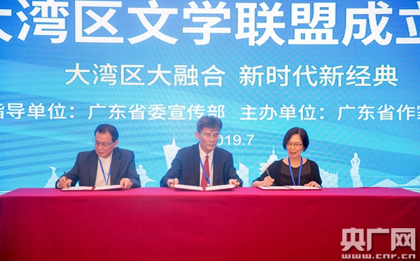 粵港澳三地代表簽下粵港澳大灣區文學聯盟。(央廣網發 主辦方供圖)