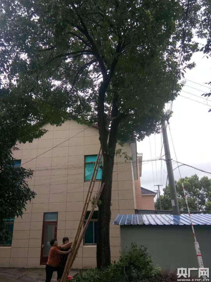 寧波市寧海縣一市鎮纜頭村黨員對過高樹木進行鋸樹(央廣網發 張春濤 攝)