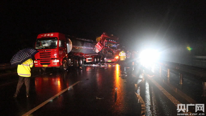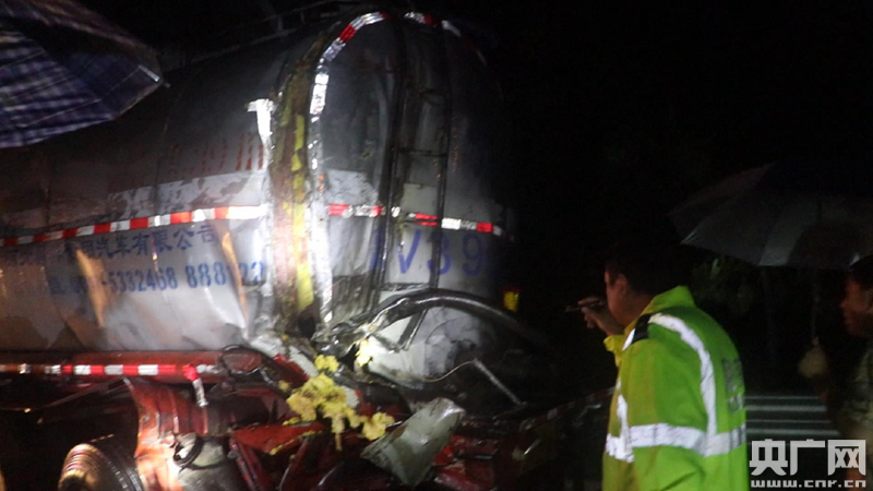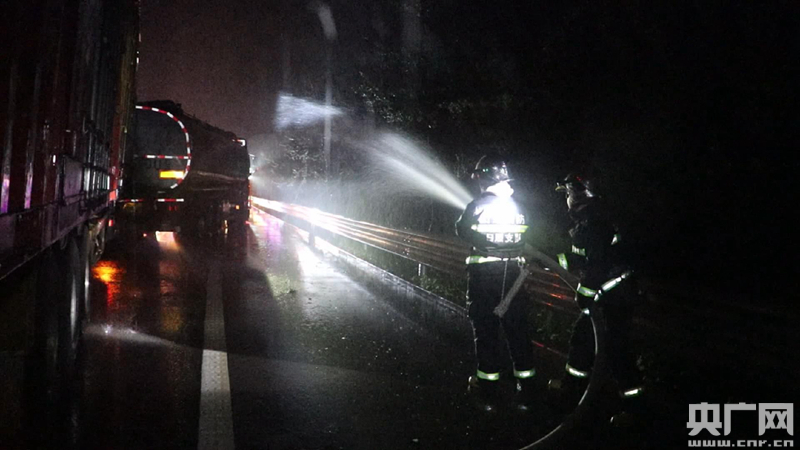 事故發生的原因是由于貨車司機疲勞駕駛,加之雨天視線不好,路面濕滑,司機剎不住車,導致貨車撞上停在路邊的甲醇罐車。(央廣網發 山東消防供圖)