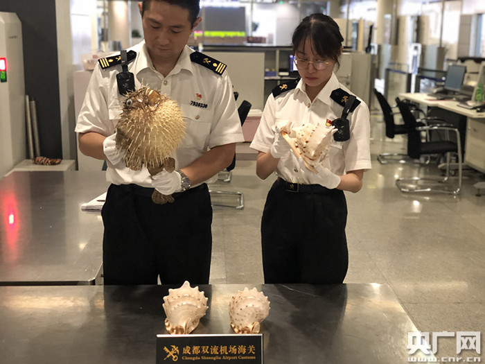唐冠螺屬于國家二級重點保護水生野生動物。根據我國法律規定,郵寄或攜帶瀕危野生動植物及其制品進出境,必須持有國家瀕管部門出具的證明并主動向海關申報;刺豚標本屬于《中華人民共和國禁止攜帶、郵寄進境的動植物及其產品名錄》第十三條規定中的動物尸體、動物標本、動物源性廢棄物。
