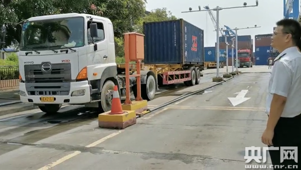 圖為當(dāng)天試點(diǎn)企業(yè)完成貨物概要申報(bào)后離開(kāi)番禺蓮花港海關(guān)監(jiān)管區(qū)。(央廣網(wǎng)發(fā) 通訊員供圖)