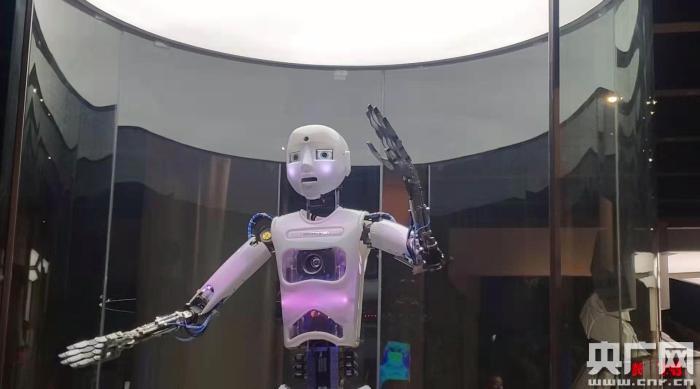人形機(jī)器人小羅正在演唱歌曲《我和我的祖國》,眼神、手勢(shì)、身姿都惟妙惟肖。(央廣網(wǎng)記者 劉陽 攝)