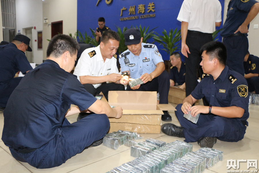 海關關警員連夜清點查獲的走私二手電子產品(央廣網發 通訊員黎燊 攝)