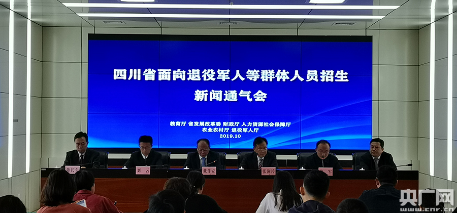 央廣網成都10月18日消息(記者劉濤)10月19日,四川省教育廳、發展改革委、財政廳、人力資源社會保障廳、農業農村廳、退役軍人事務廳聯合召開新聞通氣會,公布《四川省2019年普通高等學校面向退役軍人等群體人員招生實施辦法的通知》。2019年四川普通高等教育高職(專科)擴招任務為7.38萬人,招生對象面向退役軍人、下崗失業人員、農民工和新型職業農民,報名工作將于2019年10月下旬進行。