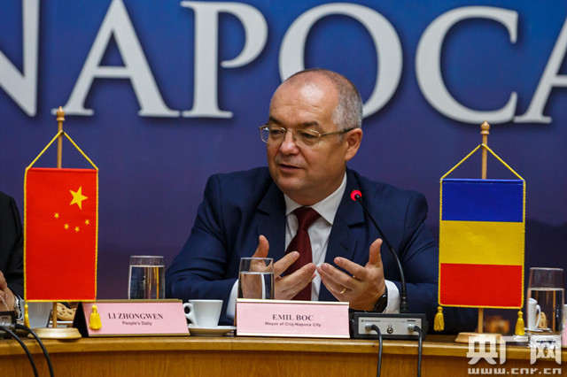 羅馬尼亞克盧日-納波卡市市長埃米爾·博克接受媒體采訪(央廣網發 圖片由克盧日-納波卡市外辦提供)