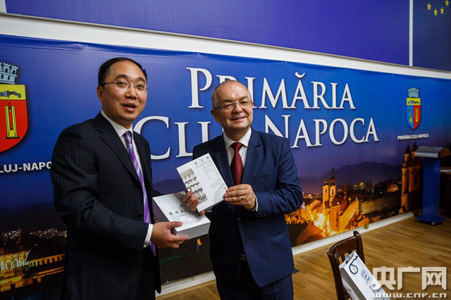 寧波市審計局的高翔今年被派往克盧日-納波卡市掛職鍛煉,圖為高翔向博克市長贈送王陽明的《傳習錄》(央廣網發 圖片由克盧日-納波卡市外辦提供)