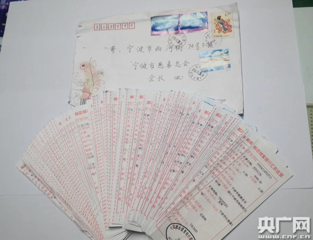 今天,寧波慈善總會收到一份掛號信,工作人員打開一看是厚厚的一沓匯款收據(jù),署名為“其然”。看到這里,工作人員知道老朋友“順其自然”又來了。細(xì)細(xì)一數(shù),共103張匯款單,101張是9999元,1張50元,1張51元。分別是從寧波市海曙區(qū)郵政大廈營業(yè)所匯款50萬元,郵儲銀行寧波分行匯款51萬元,都是11月26日匯出。與以往一樣,“順其自然”將103張匯款收據(jù)寄給寧波慈善總會,信上地址為長春路1號。