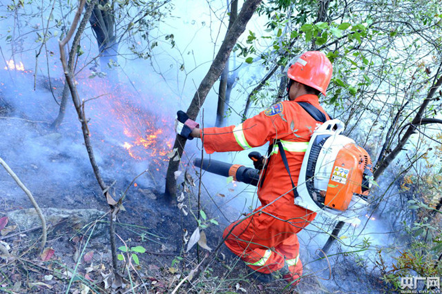 森林消防員在陡峭山坡迅速撲滅火頭(央廣網(wǎng)發(fā) 廣東省應(yīng)急管理廳供圖)