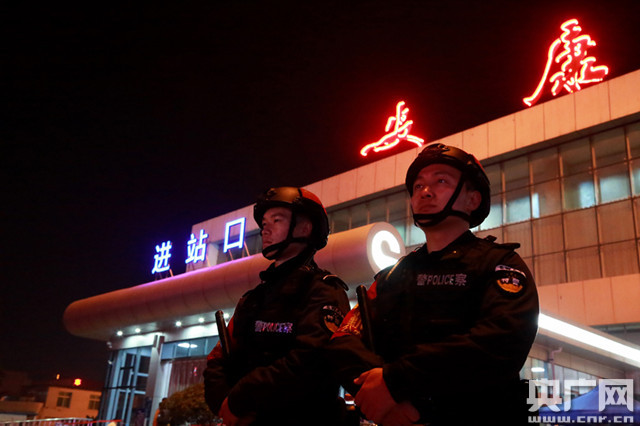 2019年12月31日晚兩名特警隊員在陜南安康火車站廣場立崗(央廣網發 郝黎俊 攝)