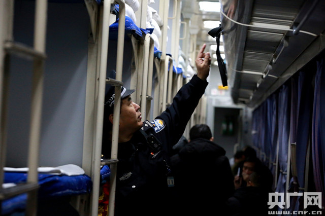 2019年12月31日晚乘警長衛志軍在臥鋪車廂巡視提醒旅客將行李架上的背包安全擺放(央廣網發 郝黎俊 攝)