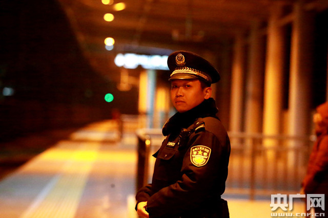 2019年12月31日晚鎮安車站站臺上新警田磊立崗(央廣網發 郝黎俊 攝)