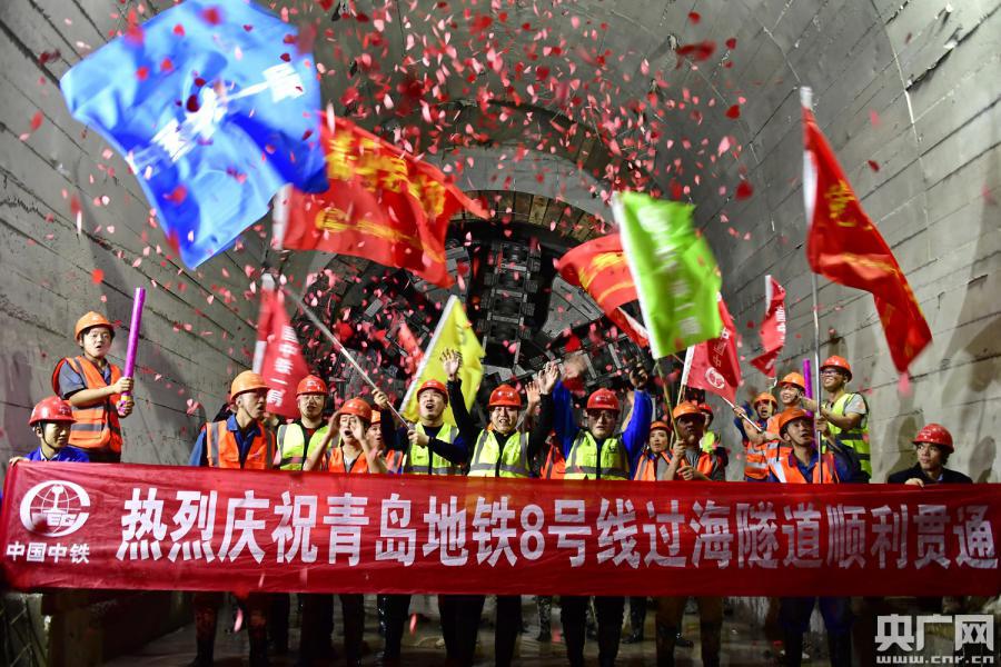 施工人員在慶祝青島地鐵8號線過海隧道貫通(央廣網發 中鐵一局宣傳部供圖)