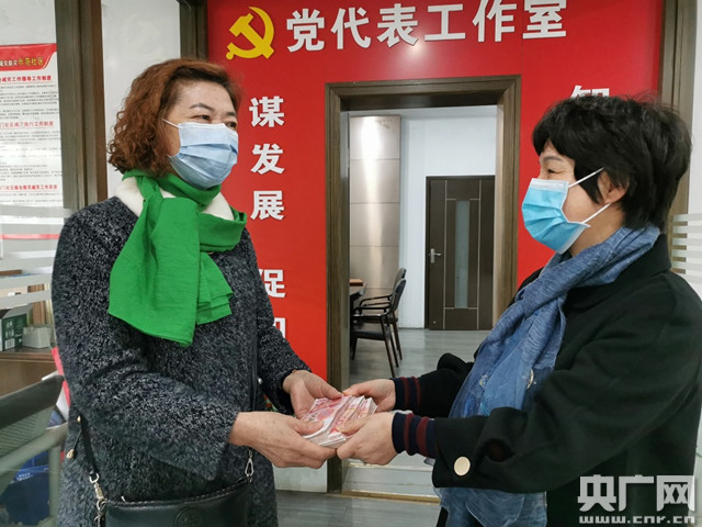 徐亞飛(左)將3萬元現(xiàn)金交到了社區(qū)黨委書記張靜波手中(央廣網(wǎng)發(fā) 招寶山街道供圖)