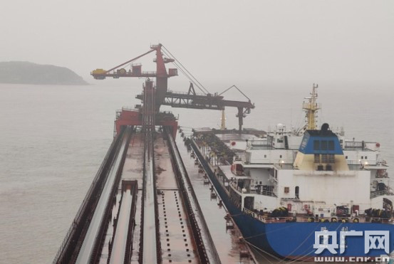 圖為“鵬利”輪正在寧波舟山港鼠浪湖礦石中轉碼頭進行裝卸作業(央廣網發 劉嘉明 攝)