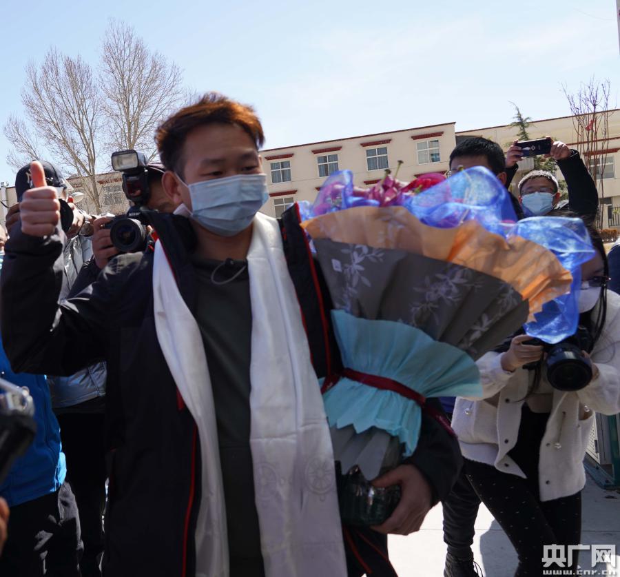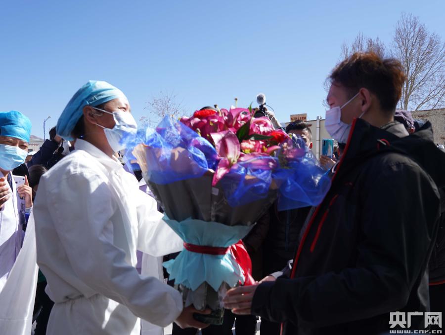 醫護人員為出院患者獻花(央廣網記者 羅布次仁 攝)