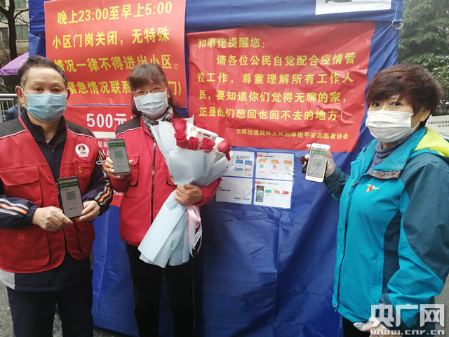 10點28分,徐大姐正在尋找下一位需要幫助介紹健康碼的居民,忽然,一大捧鮮花冷不丁遞了過來,把徐大姐嚇了一跳,仔細一看,原來是老伴陶師傅。“哎,你不是說出去買菜啊?”徐大姐笑著“責怪”著陶師傅。