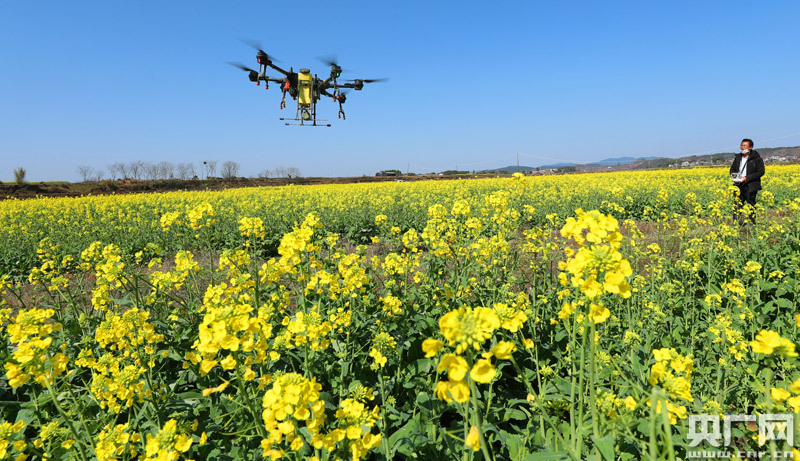 2月17日,在江西省吉安市泰和縣萬合鎮江南村油菜種植大戶劉道彪的百畝油菜地里,無人機正在進行植保作業。(央廣網發 鄧和平 攝)