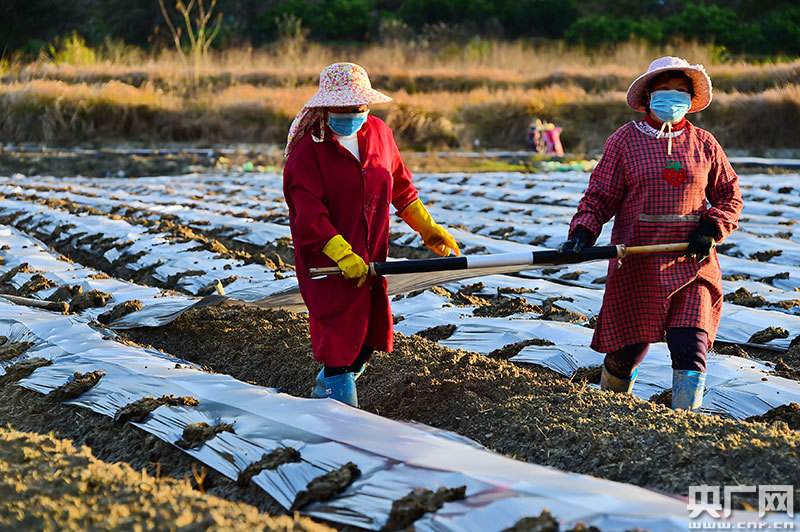 江西省贛州市會昌縣珠蘭鄉下照村,農事“鐘點工”佩戴著口罩在田間覆蓋地膜(央廣網發 朱海鵬 攝)