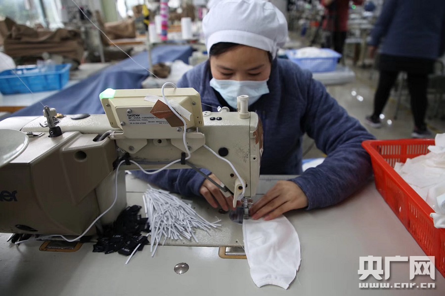企業生產車間工人正在趕制口罩(央廣網發 江北區供圖)