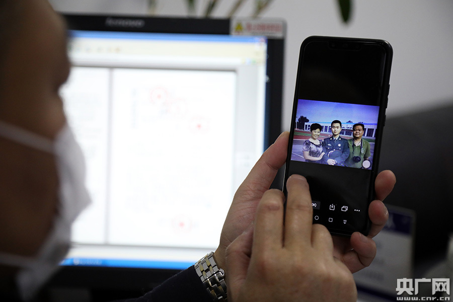 鄔列軍翻看手機中一家三口的合影(央廣網發 通訊員王曉丹 攝)