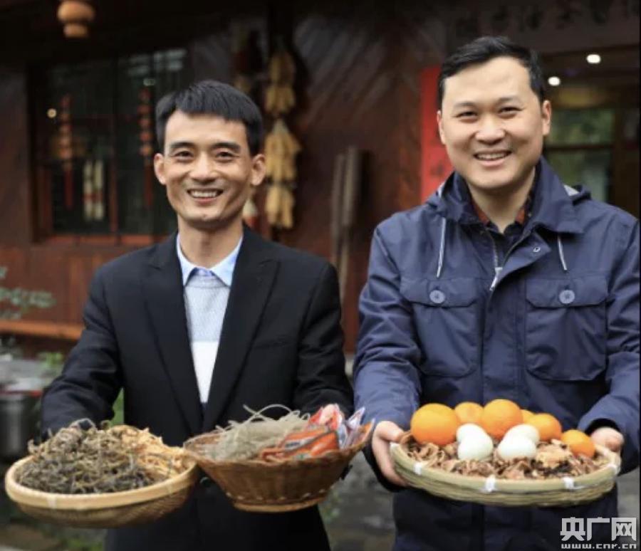 邵陽城步縣副縣長劉書軍(右)當起“主播”推銷當地農特產品(央廣網發 城步縣政府供圖)