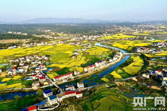 金黃的油菜花與村莊相映成趣,交織成一幅美麗清新的鄉(xiāng)村圖畫(央廣網(wǎng)發(fā) 嚴(yán)伯霖 攝)