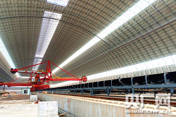 湖南岳陽城陵磯港環保提質改造項目主體工程——全封閉“膠囊”形散貨大棚內部(央廣網記者 堯遙 攝)