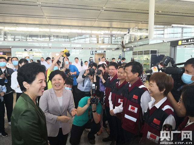 湖南省委副書記烏蘭、湖南省副省長吳桂英一行在機場為專家組送行,祝愿平安歸來(央廣網記者 姜文婧 攝)