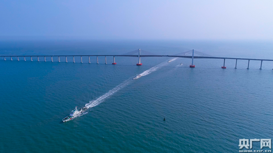 圖為汕頭海警局編隊艦艇經過汕頭南澳大橋(央廣網發 汕頭海警局供圖)