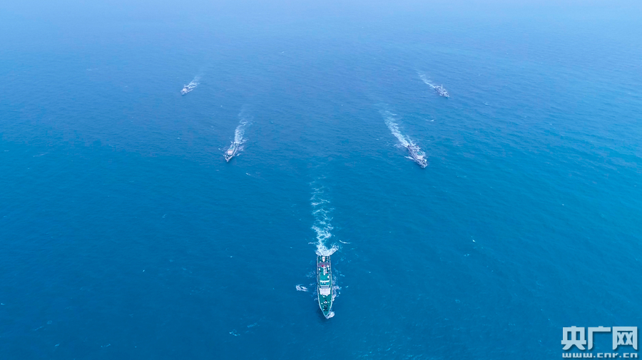 圖為汕頭海警局艦艇艦艇人字隊型航行(央廣網發 汕頭海警局供圖)