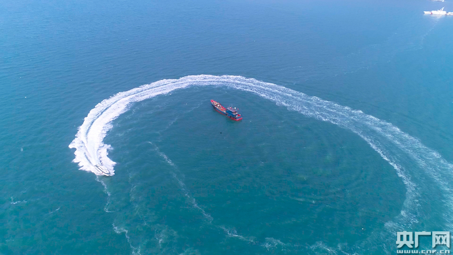 圖為汕頭海警局艦艇對“落水人員”救助科目訓練(央廣網發 汕頭海警局供圖)