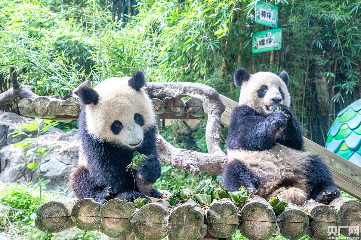 據(jù)了解,自一歲半斷奶后就一起長大的大熊貓“隆仔”和“婷仔”的粽子里,主要是竹筍和嫩竹葉。記者在長隆野生動物世界巨竹林看到有趣的一幕,快兩歲的“隆仔”和“婷仔”一開始為了爭食粽子攀爬竹臺互不相讓,誰都搶不到。“隆仔”退而求其次改道從爬梯爬上,捷足先登,而“婷仔”最終幾經波折爬上放著粽子的竹臺,終于分到“一杯羹”,兄弟倆最終其樂融融,一起品嘗美味的粽子。