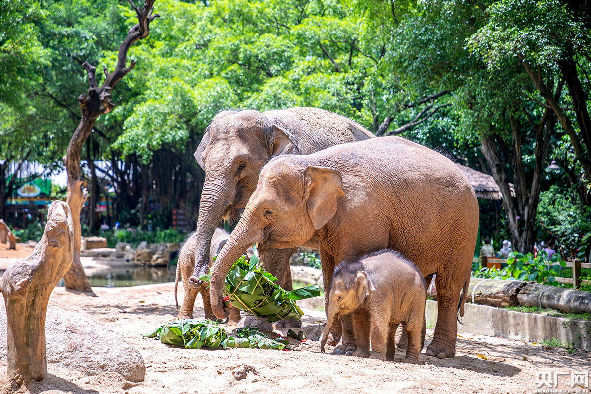 體型最大的亞洲象,粽子的體積最大,種類也最多,分成樹葉和水果粽子兩種,水果粽子里有西瓜、哈密瓜、火龍果等。只見今年4月30日和5月12日分別生下小象的母象“莉娜”和“伊拉”先把粽子踩碎再采食,還在喝奶的小象兄妹則在一旁玩耍,好不愜意。