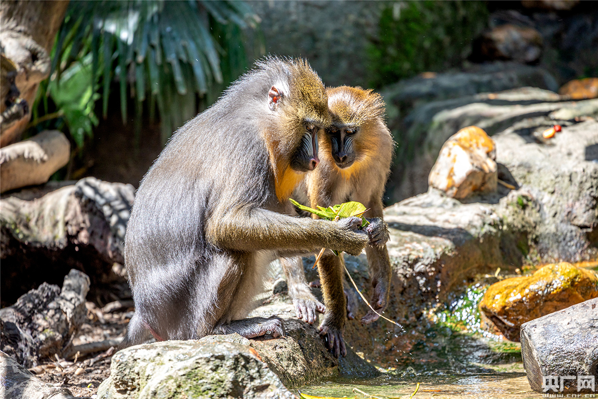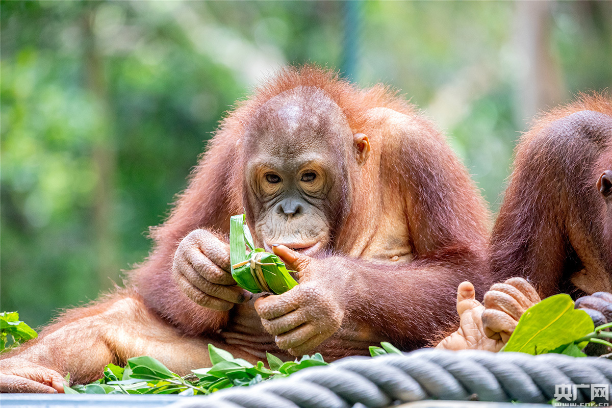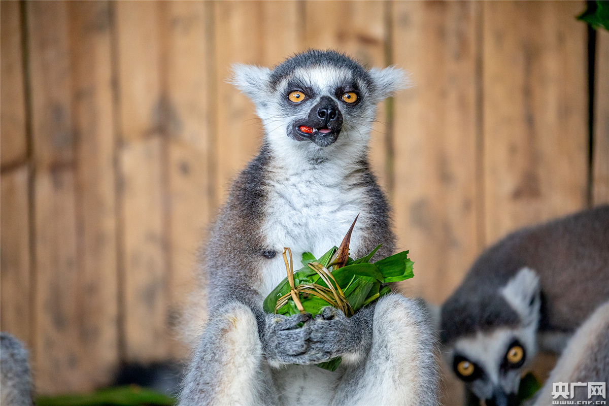 黃猩猩、山魈和節(jié)尾狐猴等靈長類動物的粽子里主要是蘋果、圣女果、香蕉、胡蘿卜、紅棗等蔬果,只見它們都非常靈活地剝開粽子,享受這頓端午節(jié)蔬果大餐。