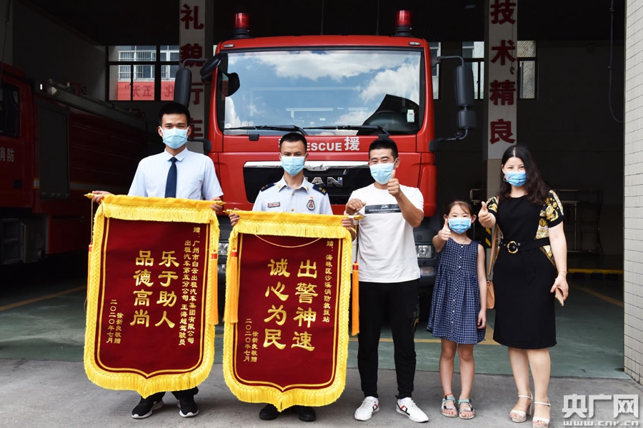 有感于這兩名廣州熱心人的相助,一周后,徐先生夫婦帶著女兒,再次從佛山來到了廣州,不過這一次他們是帶著的是兩面錦旗,特意來到沙溪消防中隊,對出租車司機王海超以及曾偉保副站長進行表揚致謝。
