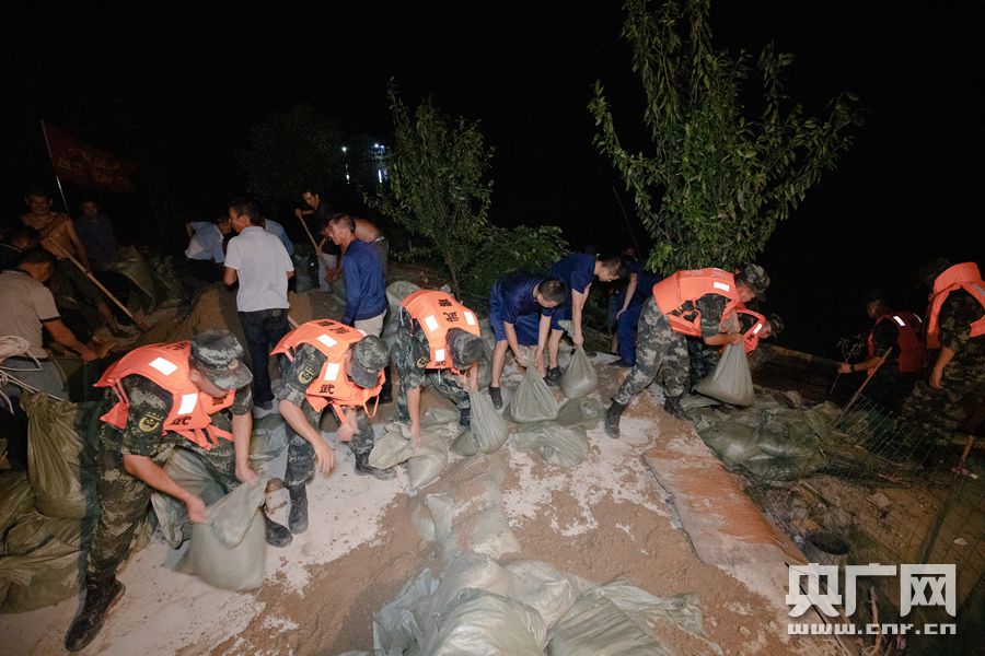 武警官兵連夜接力搬運沙包(央廣網發 通訊員供圖)