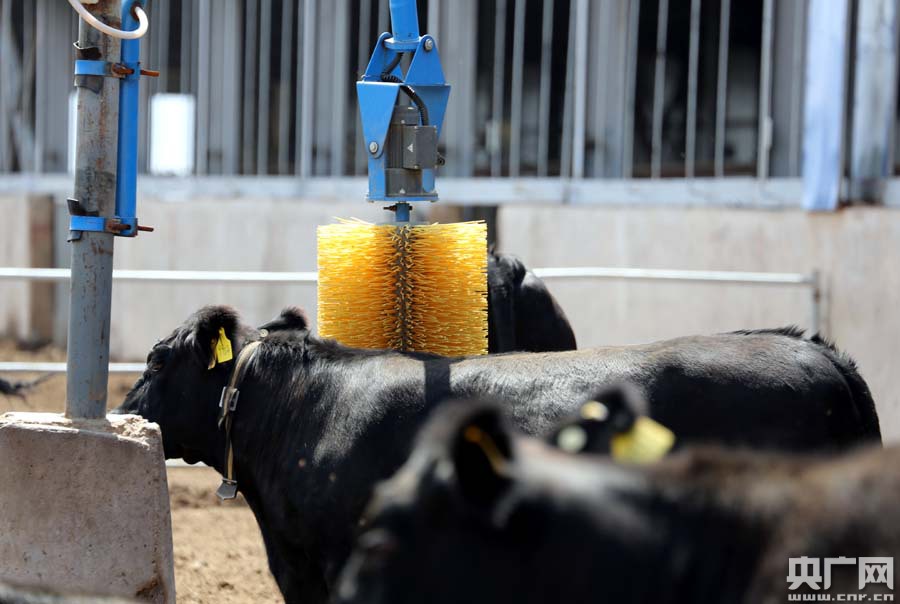 牛舍里大大小小的智能化設(shè)備都或多或少地顯示了這是一家現(xiàn)代科技含量十足的養(yǎng)殖基地,與傳統(tǒng)的養(yǎng)殖場(chǎng)有很大的不同。臉上曬得黑里透紅的基地負(fù)責(zé)人楊劍在現(xiàn)代化的牛圈里,干脆拉下了口罩:“看看,我們的牛圈空氣里,沒有濃烈的氣味;牛舍一直保持著干燥整潔,自行研制的牛體刷為牛兒們自動(dòng)按摩,所有的牛都在攝像頭下活動(dòng),嚴(yán)禁給它們使用抗生素的藥物。這酷似五星級(jí)賓館的牛舍,才能產(chǎn)出高品質(zhì)的安格斯牛肉!”