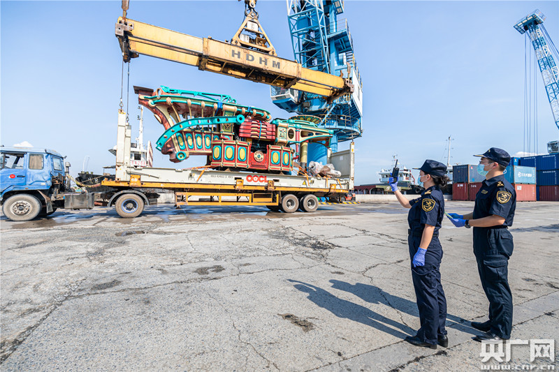 廣州海關所屬番禺海關關員對進口花車“船邊直提”進行監管(央廣網發 董建華 攝)