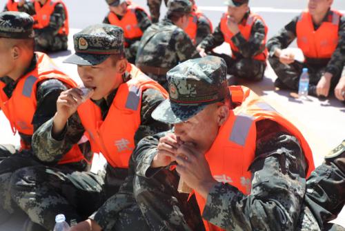 武警戰(zhàn)士在休息點(diǎn)簡(jiǎn)陋就餐(圖片攝影:張華釗)