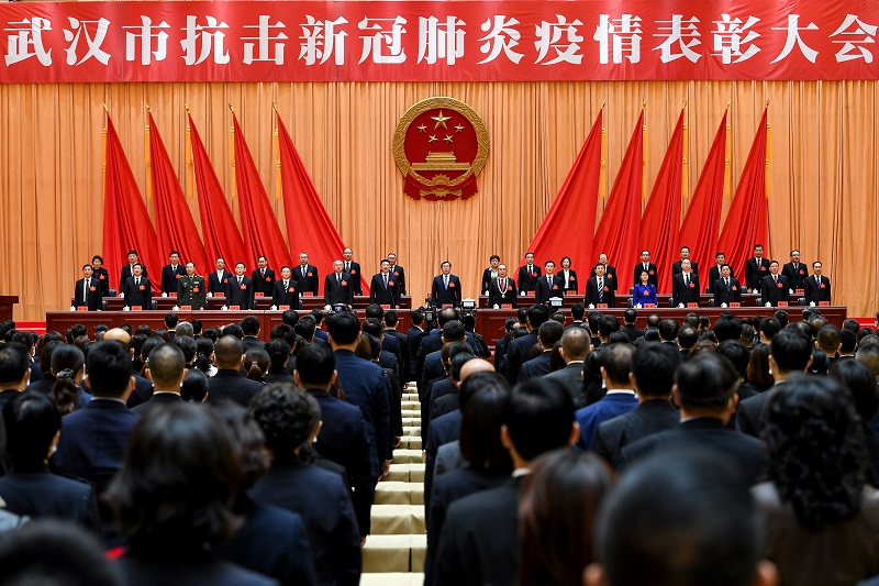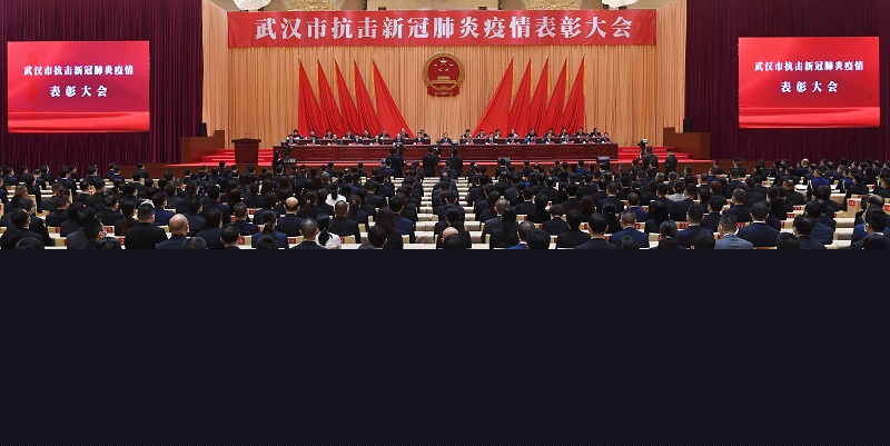 會(huì)場(chǎng)氣氛莊嚴(yán)熱烈。主席臺(tái)上方懸掛著“武漢市抗擊新冠肺炎疫情表彰大會(huì)”會(huì)標(biāo);后幕正中是熠熠生輝的中華人民共和國(guó)國(guó)徽,10面紅旗分列兩側(cè);會(huì)場(chǎng)后側(cè)豎起巨幅標(biāo)語(yǔ):“緊密團(tuán)結(jié)在以習(xí)近平同志為核心的黨中央周?chē)罅霌P(yáng)偉大抗疫精神,主動(dòng)作為,奮發(fā)有為,為加快建設(shè)國(guó)家中心城市,打造國(guó)際化大都市努力奮斗!”