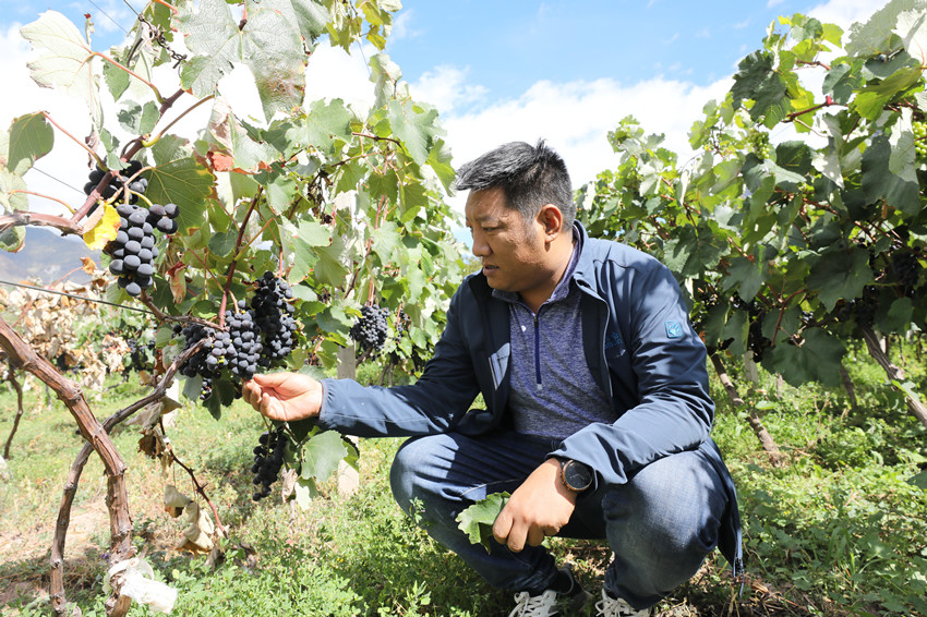 洛松次仁查看葡萄生長情況(央廣記者 普布次仁 攝)