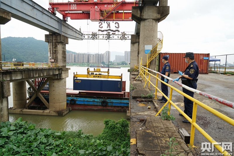 圖為海關關員對固體廢物裝船過程實施全程監管(央廣網發 李靜 攝)