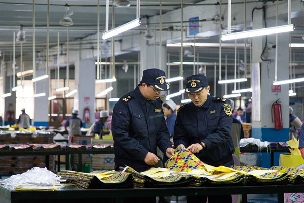 濟(jì)南海關(guān)工作人員正在查看出口非洲的蠟印布生產(chǎn)情況(央廣網(wǎng)發(fā) 鄭保國攝)
