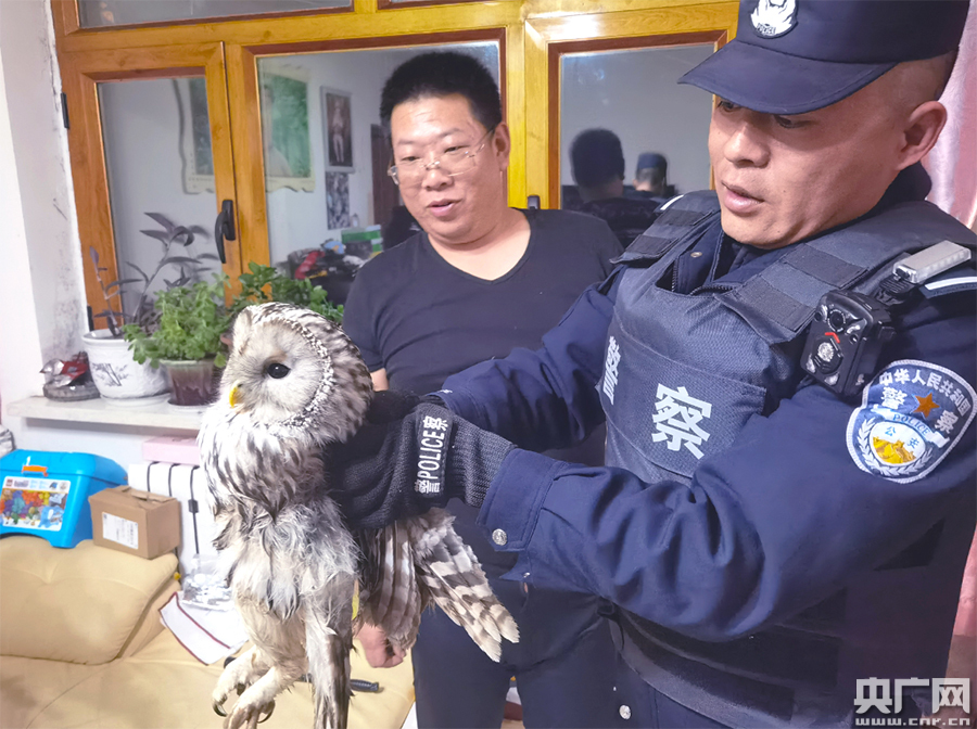 當晚22時許,伊爾施邊境派出所接到轄區居民報警,稱其在家里闖進一只疑似貓頭鷹。民警立即趕赴現場,檢查發現,該動物身體長約40厘米,翅展80cm,有橫斑,爪子比較鋒利,雖然身上并無明顯外傷,但其身子虛弱。民警遂將其帶回派出所找來食物和水對其進行喂養,幫助恢復體力。經專家人士辨認,此動物為國家二級保護動物貓頭鷹。目前,該貓頭鷹已移交當地森林部門送往有救治條件的場所進一步治療,待傷勢痊愈后放歸大自然。