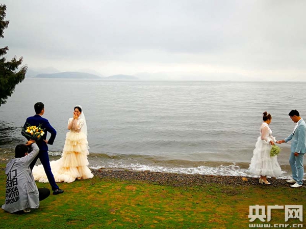 在洱海拍攝婚紗照(央廣記者張雷 攝)