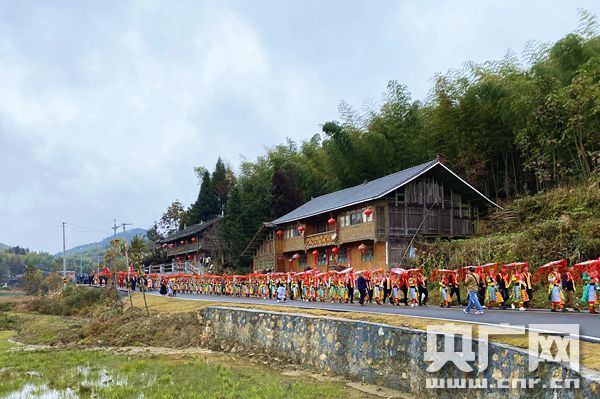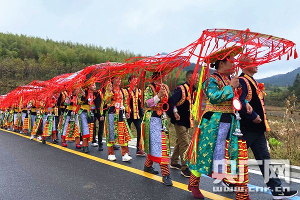 湖南隆回虎形山瑤族鄉(xiāng)崇木凼村,婚禮隊(duì)伍浩浩蕩蕩(央廣網(wǎng)記者 堯遙 攝)