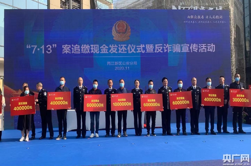 央廣網重慶11月19日消息(記者陳鵬)今天上午,重慶兩江新區警方舉行7·13特大外匯詐騙案追繳現金發還儀式暨反詐騙宣傳活動,將追回的1.2億元現金集中發還受損群眾,此次追繳發還的現金占該案被騙資金80%以上。