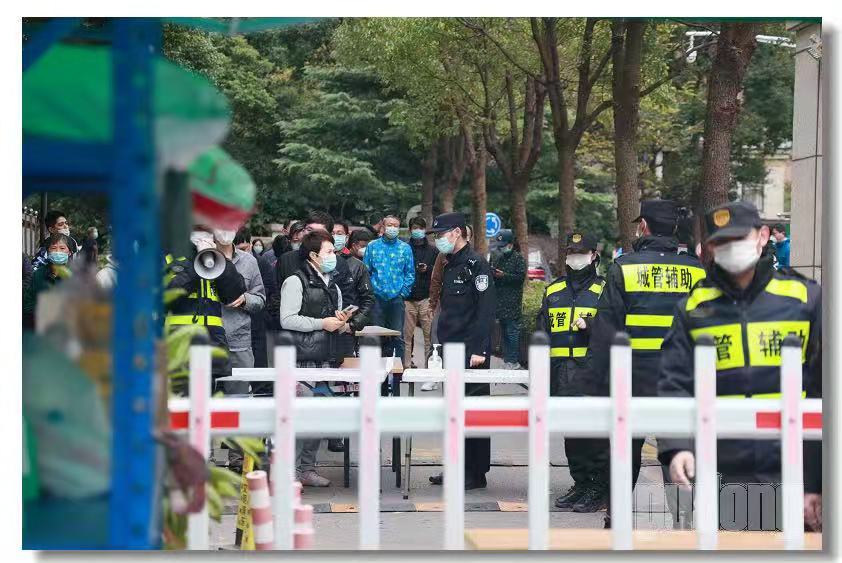 當(dāng)晚20時(shí),沈維和同事們“全副武裝”做好防護(hù)措施后一起趕到小區(qū)內(nèi),配合醫(yī)務(wù)人員維持臨時(shí)檢測(cè)點(diǎn)的秩序,同時(shí)和居委工作人員一起挨家挨戶通知住戶前去接受檢測(cè)。對(duì)于發(fā)現(xiàn)病例的52號(hào)樓,所有人都敬而遠(yuǎn)之,于是沈維和同事主動(dòng)承擔(dān)起了這里居民的核查工作。小區(qū)居民完成檢測(cè)已是半夜時(shí)分,沈維忙碌了幾個(gè)小時(shí)仍未停歇,考慮到當(dāng)天是工作日,部分居民陸續(xù)回家可能還未做檢測(cè),他和同事再次逐棟走訪,一家一家確認(rèn)檢測(cè)情況,這一忙就到了早上8點(diǎn)。