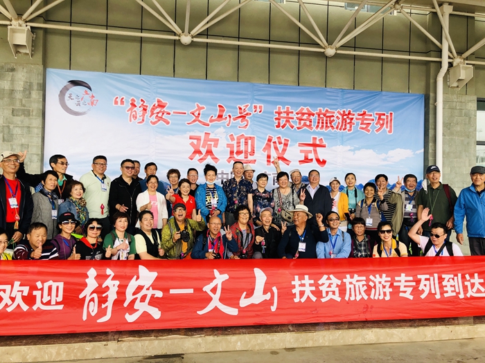 2020年跨省游政策放開后全國首趟鐵路扶貧旅游專列“靜安-文山號”成功開行(央廣網發 靜安新聞辦供圖)