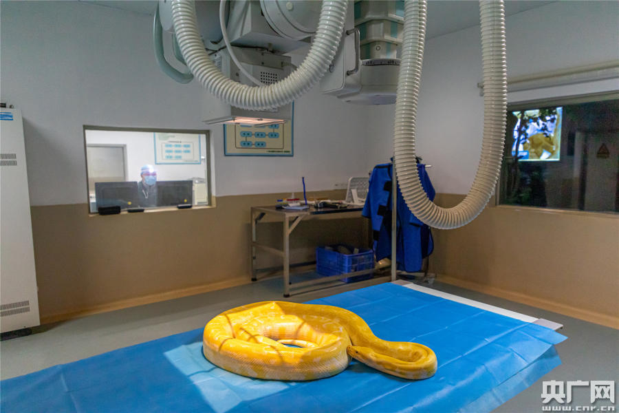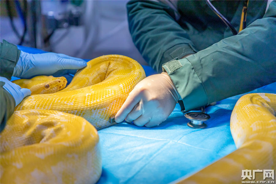 獸醫對黃金蟒進行抽血,供后續檢查使用(央廣網發 通訊員供圖)